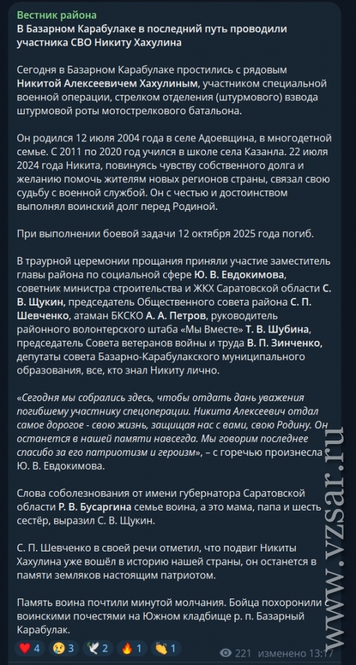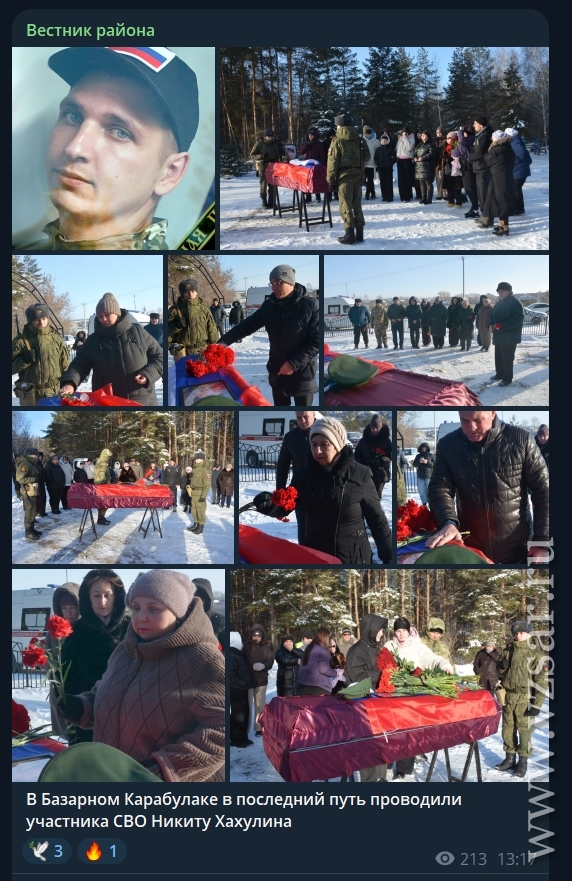 Базарно-Карабулакское издание "Вестник района" рассказало о погибшем рядовом Никите Хахулине.