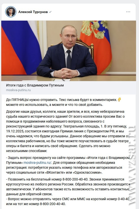 Данный текст сотрудники театра и их сторонники отправляют на прямую линию Владимира Путина.
