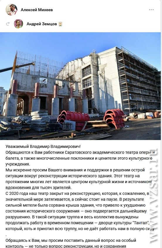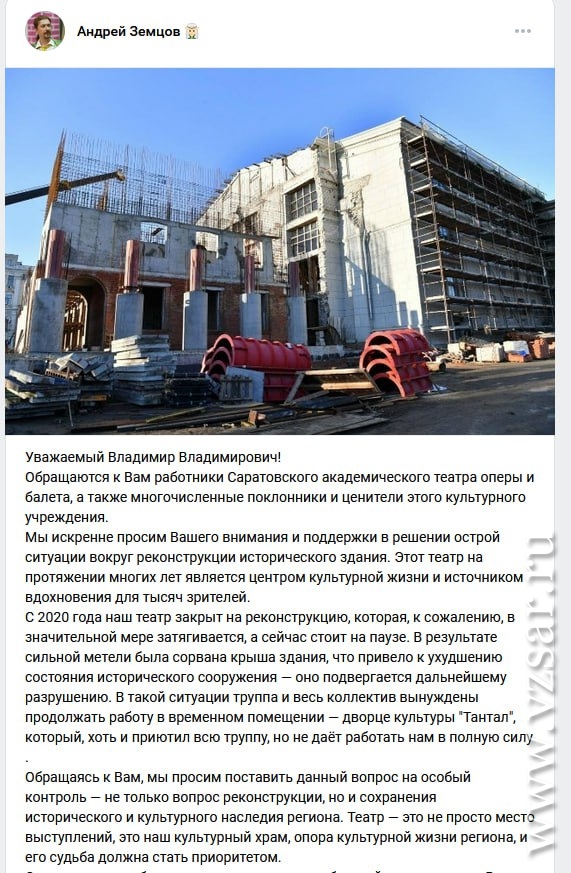 Обращаются к Вам работники Саратовского академического театра оперы и балета, а также многочисленные поклонники и ценители этого культурного учреждения.