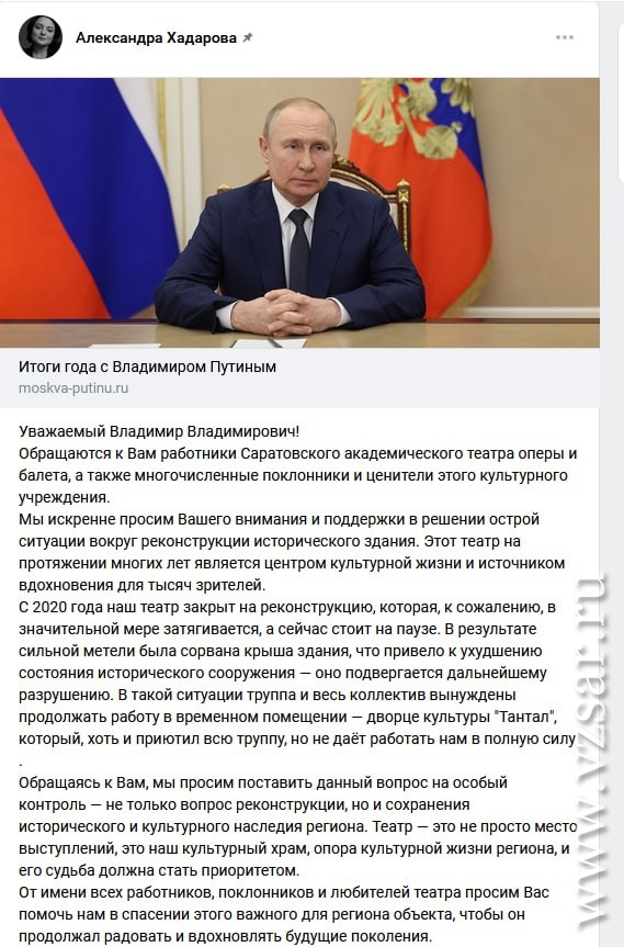 Сотрудники Саратовского академического театра оперы и балета и местные поклонники искусства выступили с открытым обращением к президенту России Владимиру Путину.