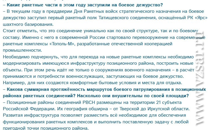 "Стоит отметить, что это соединение уникально как по своей структуре, так и по боевому составу. Именно с него в современной России стартовало перевооружение на современные ракетные комплексы "Тополь-М", разработанные отечественной кооперацией промышленности", - заявил военачальник.