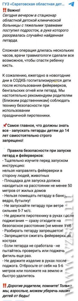 Вчера вечером в Саратовскую областную детскую клиническую больницу с тяжелыми травмами поступил подросток, в руке которого разорвалась случайно найденная петарда.