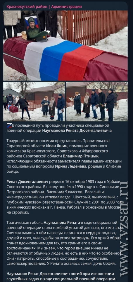 Администрация Краснокутского района сообщила о прошедшем прощании с погибшим Ренатом Наугмановым.