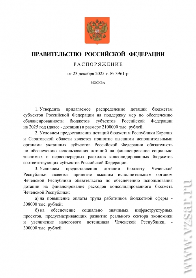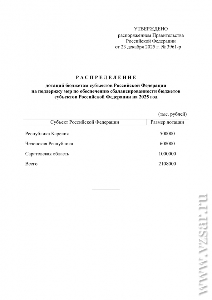 Около 5,5 млрд рублей будет направлено на поддержание сбалансированности бюджетов Кемеровской и Саратовской областей, Карелии и Чечни.