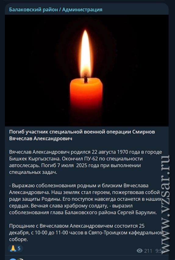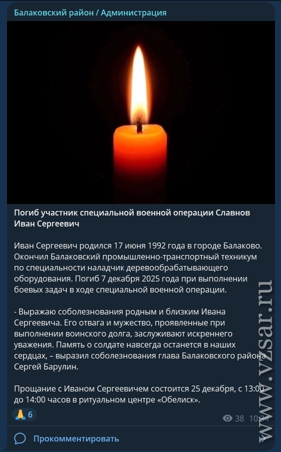 Администрация Балаковского района сообщает, что завтра пройдет прощание с погибшими Иваном Славновым и Вячеславом Смирновым.