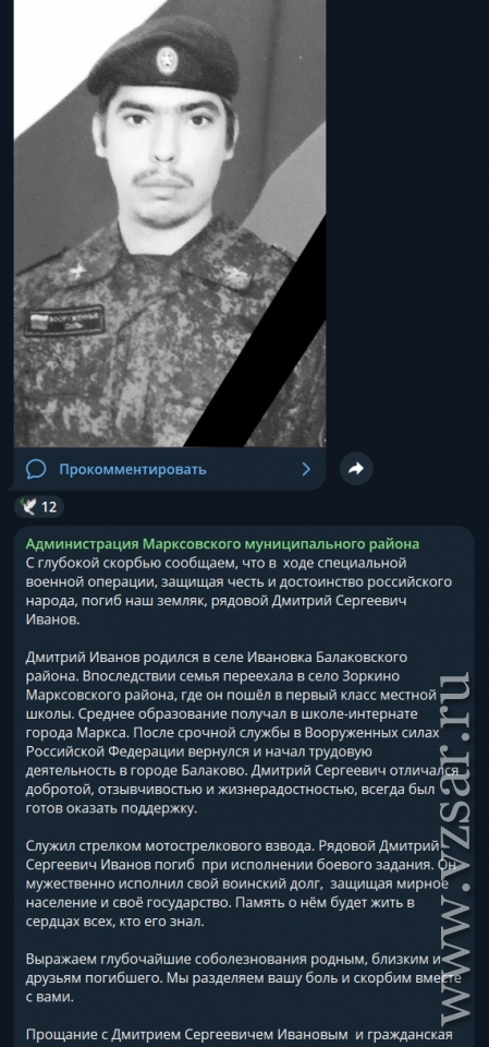 Также администрация Марксовского района рассказала, что в пятницу в селе Васильевка состоится прощание с погибшим Дмитрием Ивановым.