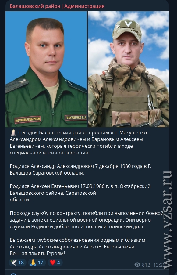 Администрация Балашовского района рассказала о прошедшем прощании с погибшими Александром Макушенко и Алексеем Барановым.
