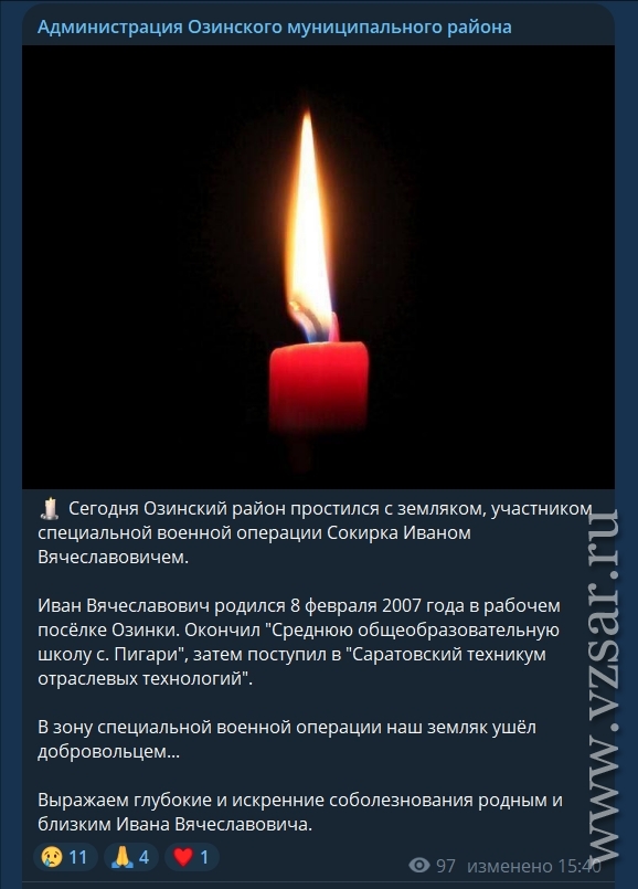 Администрация Озинского района рассказала о прошедшем сегодня прощании с погибшим Иваном Сокиркой.