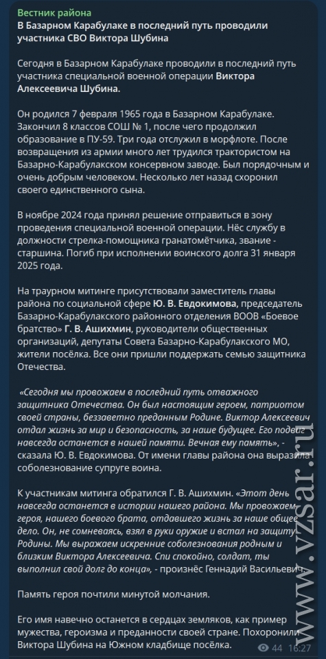 Базарно-Карабулакское издание "Вестник района" рассказало о прошедшем сегодня прощании с Виктором Шубиным.