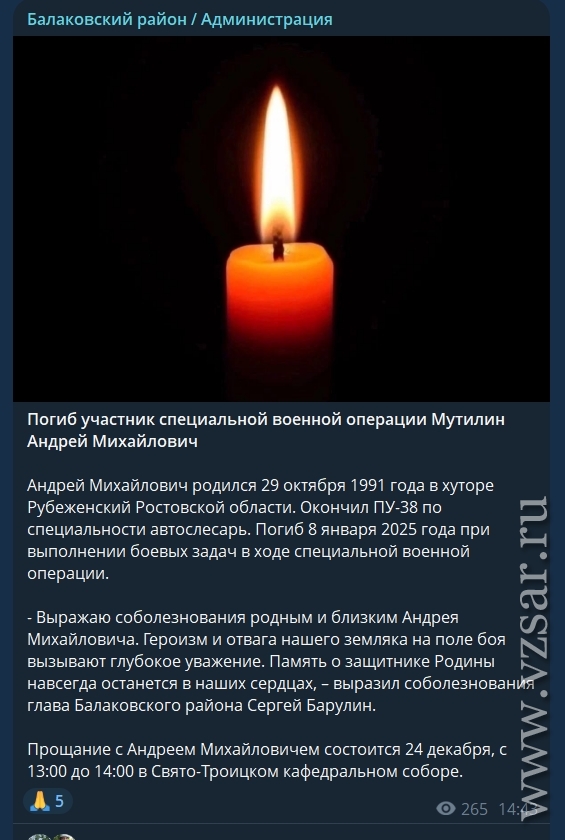 Администрация Балаковского района рассказала о гибели Андрея Мутилина.