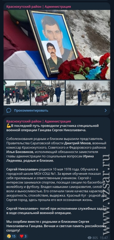 А администрация Ершовского района рассказала о гибели Алексея Петрова.