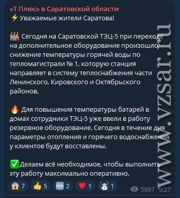 Сегодня утром Саратовский филиал ПАО "Т Плюс" сообщил о проблемах с подачей тепла в дома областного центра.