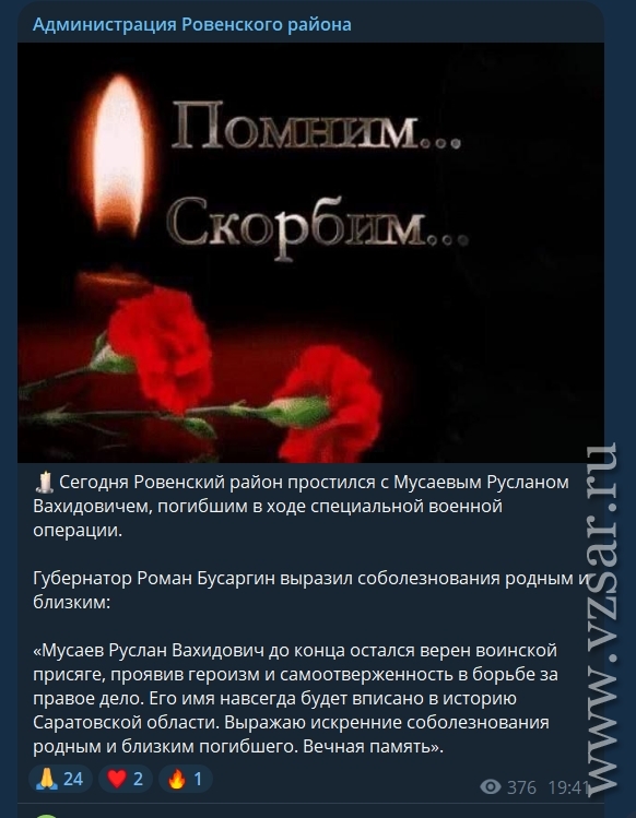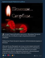 Администрация Ровенского района сообщила о прошедшем прощании с погибшим Русланом Мусаевым.