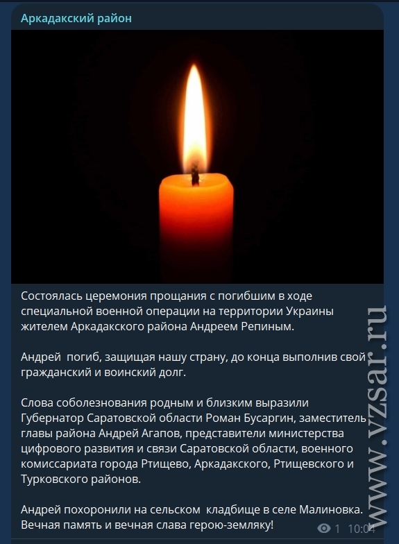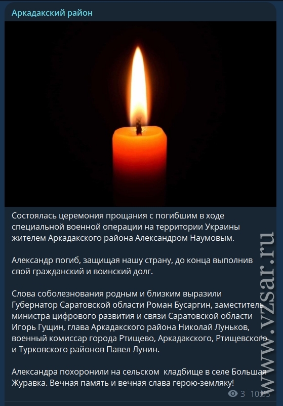 Администрация Аркадакского района рассказа о прошедшем прощании в селе Большая Журавка с Александром Наумовым, а в селе Малиновка – прощании с погибшим Андреем Репиным.
