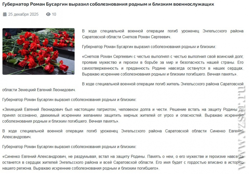 Администрация Энгельсского района без подробностей сообщила о гибели Романа Снеткова, Евгения Земецкого, Евгения Синенко, Вячеслава Серебрякова и Алексея Сличенко.