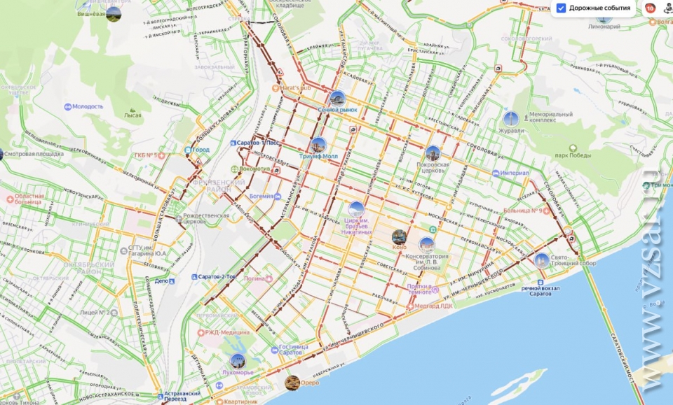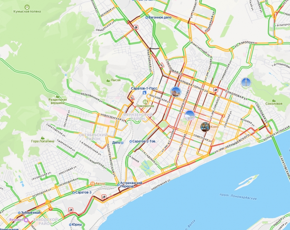 Центр города практически стоит полностью, также плохая ситуация на улице Чернышевского, въезде в Заводской район, СХИ, Стрелке, улице Соколовой, Шехурдина и на подъездах к мосту Саратов-Энгельс.