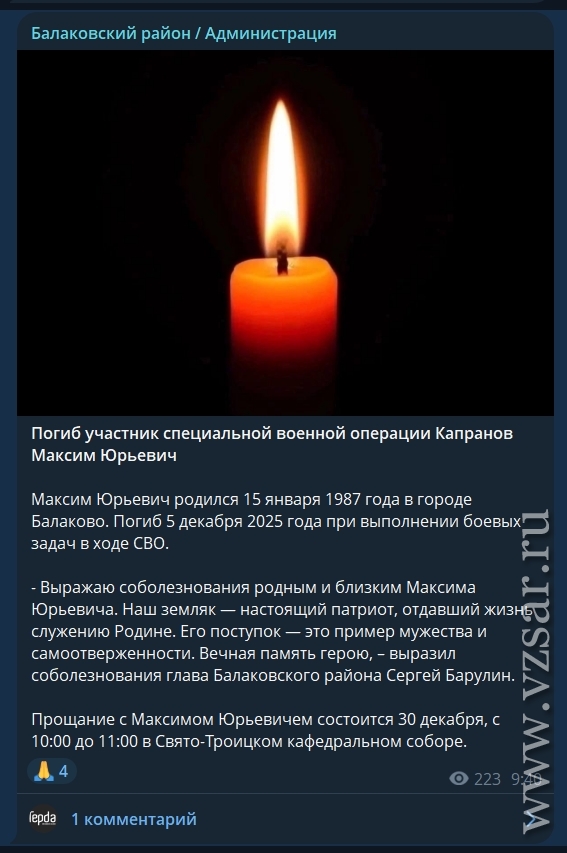 Администрация Балаковского района сообщает, что завтра пройдет прощание с погибшими Максимом Капрановым, Алексеем Борисовым и Андреем Бирючковым.