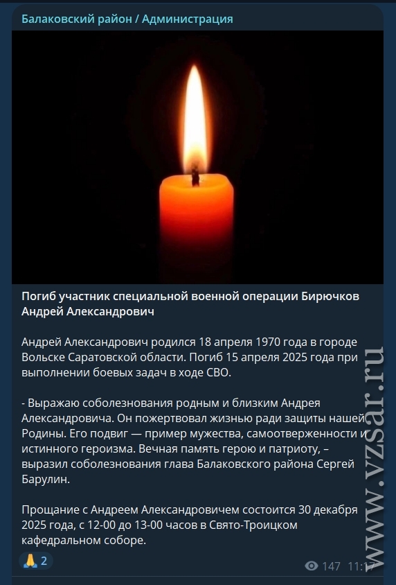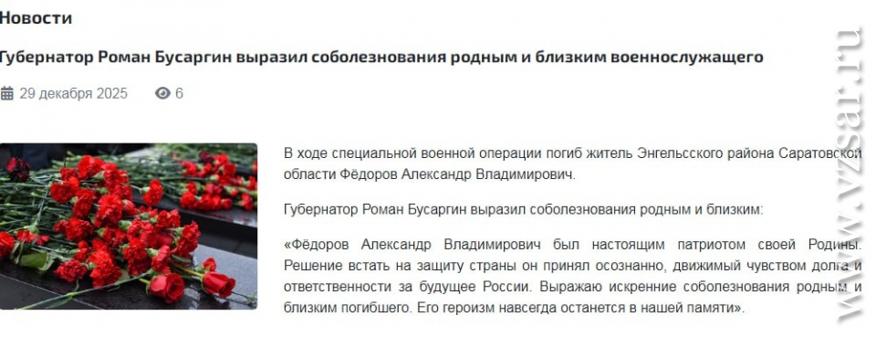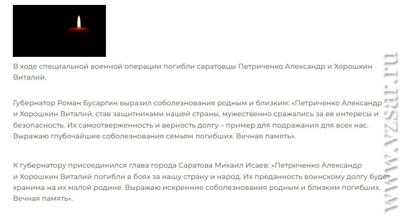 Администрация Саратова без подробностей рассказала о гибели Александра Петриченко и Виталия Хорошкина, а администрация Энгельсского района – о гибели Александра Федорова.