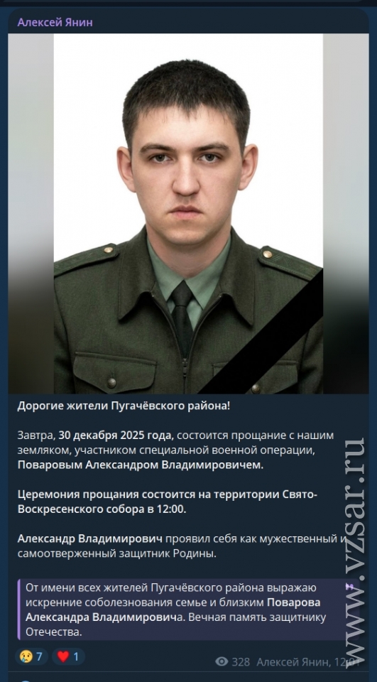 Глава Пугачевского района Алексей Янин сообщает, что завтра состоится прощание с погибшим Александром Поваровым.