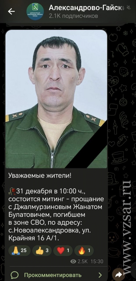 Администрация Александрово-Гайского района сообщает, что в тот же день в селе Новоалександровка проводят в последний путь Жаната Джалмурзинова.