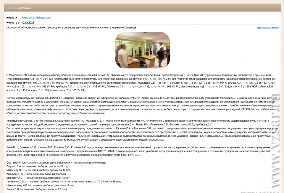 Этому был посвящен развернутый материал "Пытки бездействием", из которого следовало, что надзор за законностью в учреждениях областного УФСИН, включая ОТБ-1, был полностью провален. Данный тезис подтвердила и ведомственная комиссия, направленная в Саратов из Генпрокуратуры после обнародования осенью 2021 года видео с пытками заключенных в тюремной больнице (публикация шокирующих видеоматериалов привела к скандалу международного уровня).