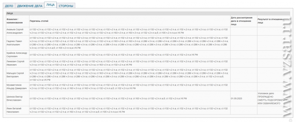 Ананьеву инкриминировали п. "а" ч. 2 ст. 132, п. "в", "ж" ч. 2 ст. 105, п. "а" ч. 3 ст. 163 УК РФ, Крайнову - п. "а" ч. 2 ст. 132 УК РФ, Линкевичу - п. "а" ч. 2 ст. 132, п. "а" ч. 3 ст. 163 УК РФ, Мухаметзянову - п. "а" ч. 2 ст. 132, п. "а" ч. 3 ст. 163 УК РФ, Янину - п. "а" ч. 2 ст. 132, п. "а" ч. 3 ст. 163, п. "в", "ж" ч. 2 ст. 105 УК РФ.