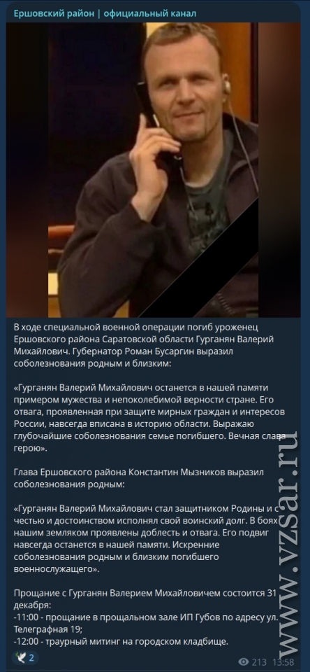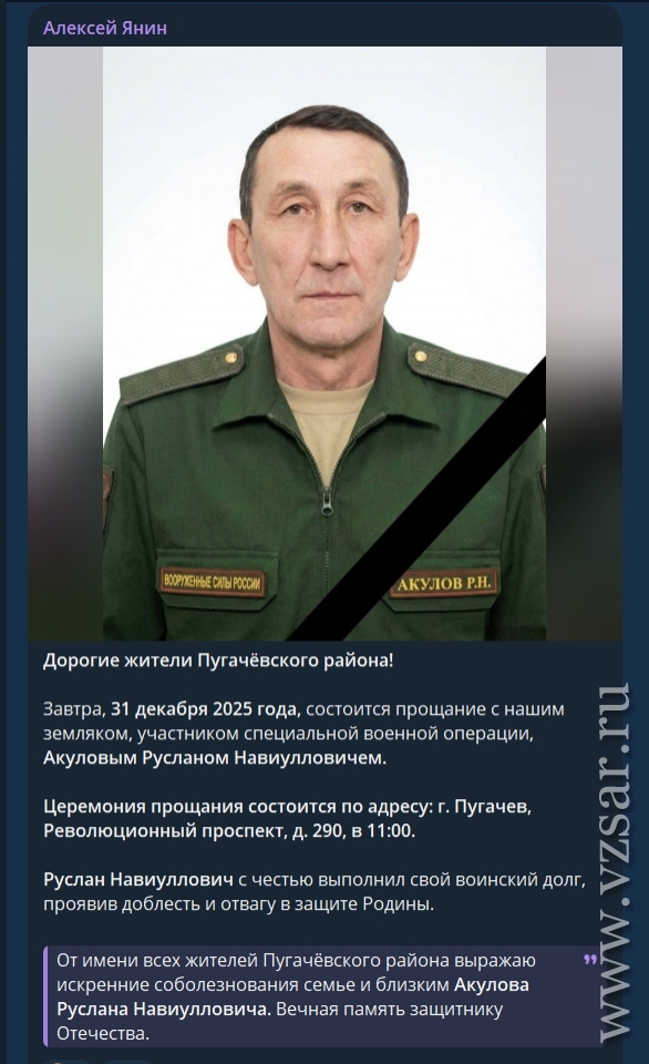 Глава Пугачевского района Алексей Янин сообщает, что с фронта не вернулся живым Руслан Акулов, а администрация Ершовского района принесла аналогичную весть о Валерии Гурганяне.