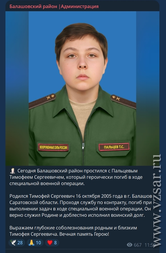 Администрация Балашовского района рассказала о смерти Тимофея Пыльцова, который родился 16 октября 2005 года в Балашове и, проходя службу по контракту, погиб при выполнении задач в ходе СВО.