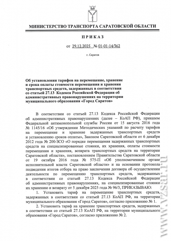В Саратове устанавливаются новые тарифы на перемещение и хранение задержанных транспортных средств. Соответствующий приказ подписал вчера региональный министр транспорта Николай Сергеев.