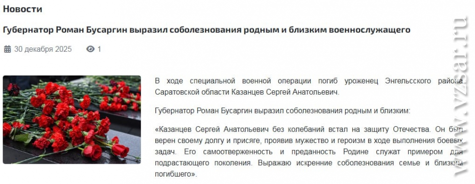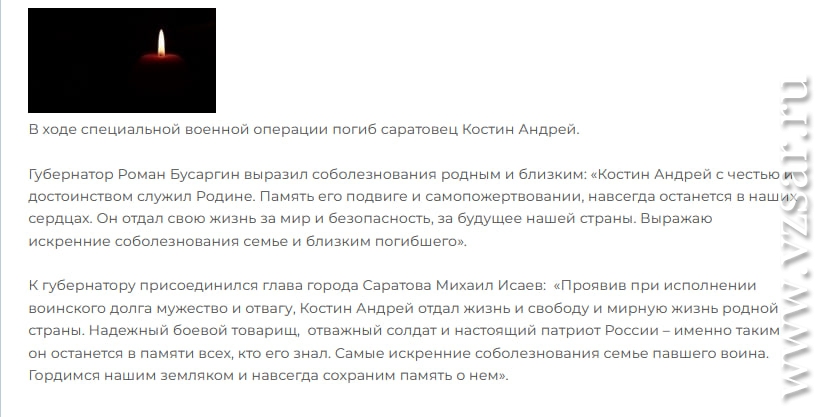 Мэрия Саратова сообщает о гибели Андрея Костина, а администрация Энгельсского района – о гибели Сергея Казанцева.