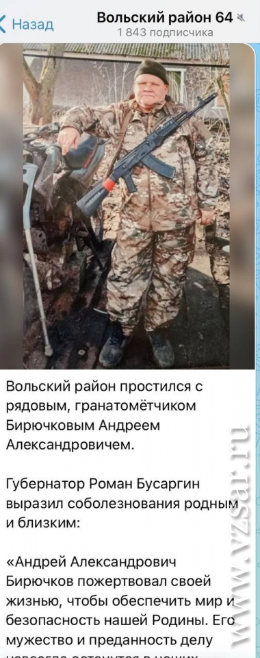А Вольский район простился с рядовым, гранатометчиком Андреем Бирючковым, рассказали в райадминистрации.