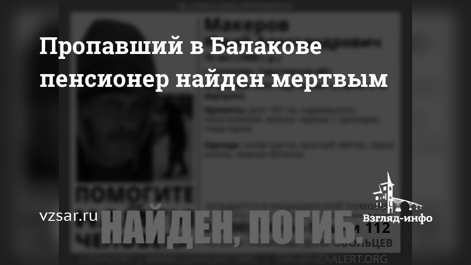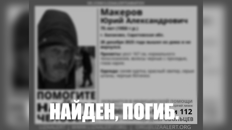 Пропавший без вести в Балакове 75-летний Юрий Макеров погиб, сообщил вечером поисковый отряд "Лиза Алерт Саратов".