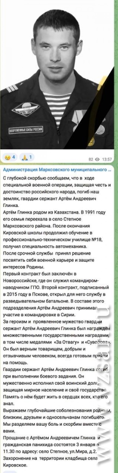 О погибшем Артеме Глинке рассказала администрация Марксовского района.