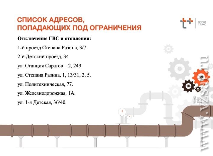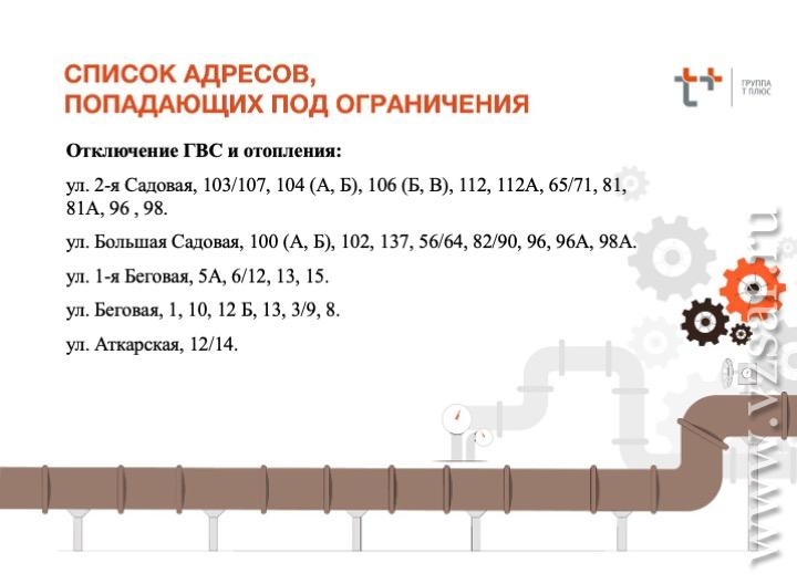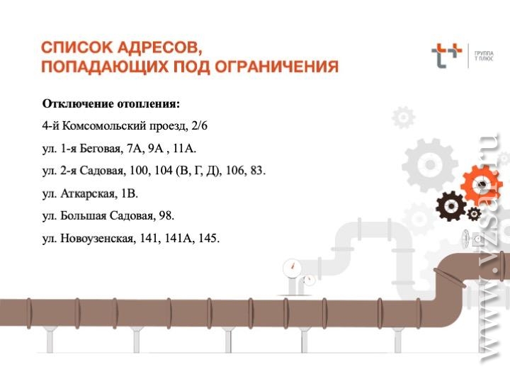 Список домов (в основном Октябрьского района города), попадающих под отключение отопления и горячей воды, смотрите в карточках.