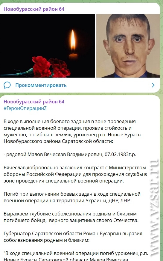 Администрация Новобурасского района уведомила о том, что живым с фронта не вернулся уроженец райцентра Вячеслав Малов (родился 7 февраля 1983 года), добровольно заключивший контракт с Минобороны для участия в СВО.