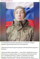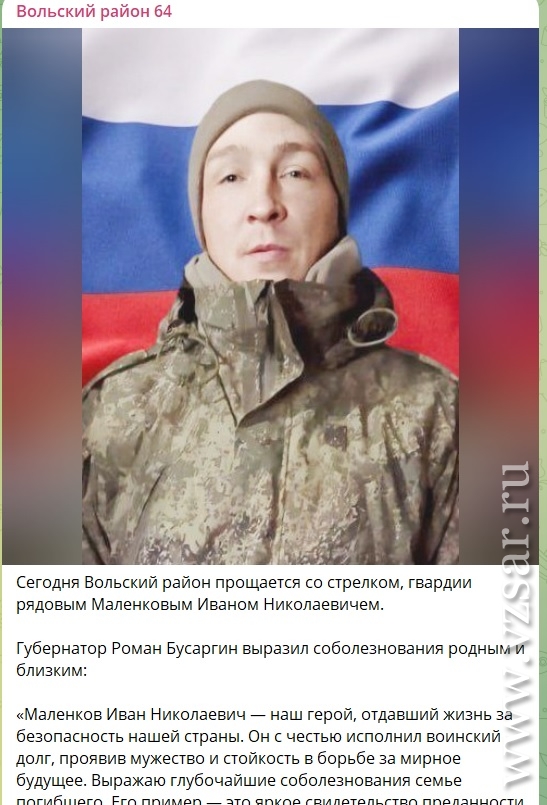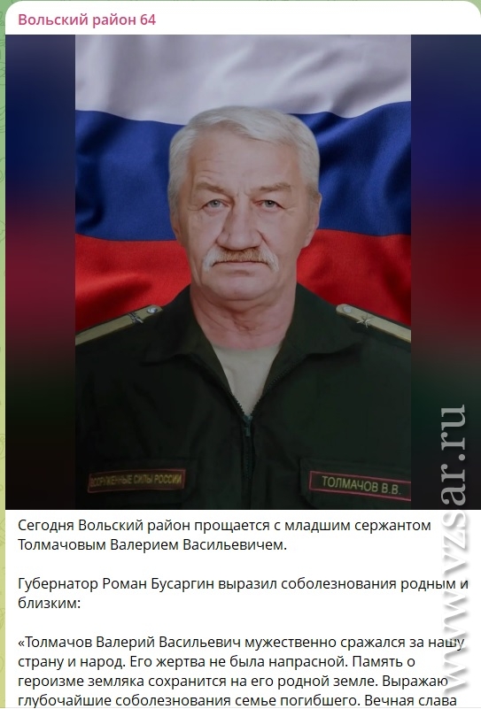 Вольская райадминистрация сообщила, что вчера муниципалитет проводил в последний путь стрелка, гвардии рядового Ивана Маленкова, которого похоронили в селе Тепловка, а сегодня в полдень в райцентре предадут земле младшего сержанта Валерия Толмачова.
