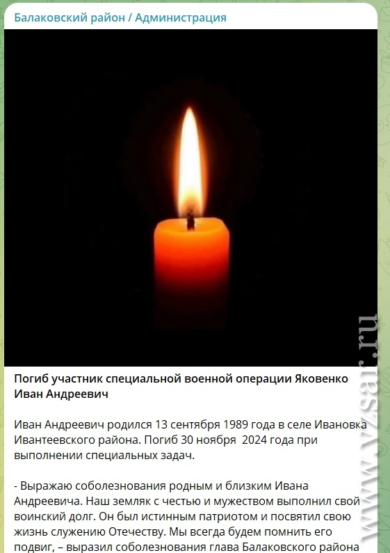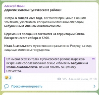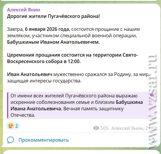 Глава Пугачевского района Алексей Янин информировал земляков о сегодняшнем прощании с Иваном Бабушкиным, а власти Балаковского МР - с Иваном Яковенко (родился 13 сентября 1989 года в селе Ивановка Ивантеевского района; погиб 30 ноября 2024 года).