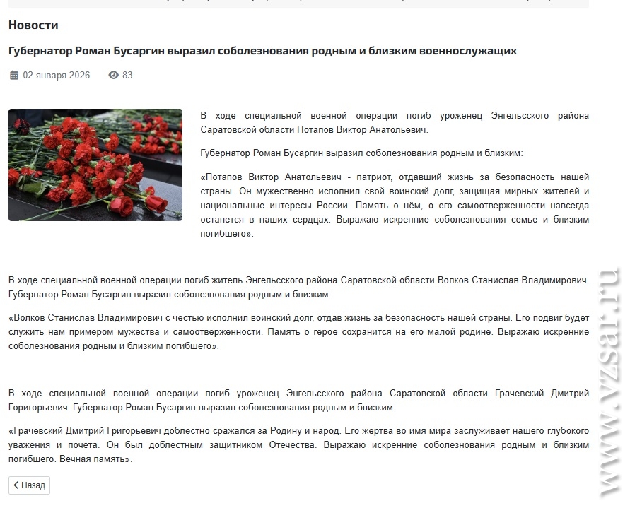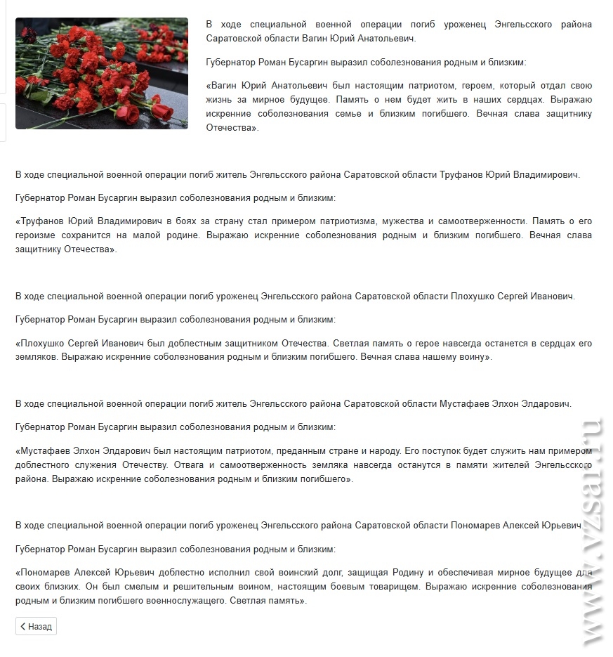 Администрация Энгельсского района сообщила о гибели еще 8 бойцов - Юрия Вагина, Юрия Труфанова, Сергея Плохушко, Элхона Мустафаева, Алексея Пономарева, Виктора Потапова, Станислава Волкова и Дмитрия Грачевского.