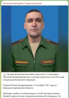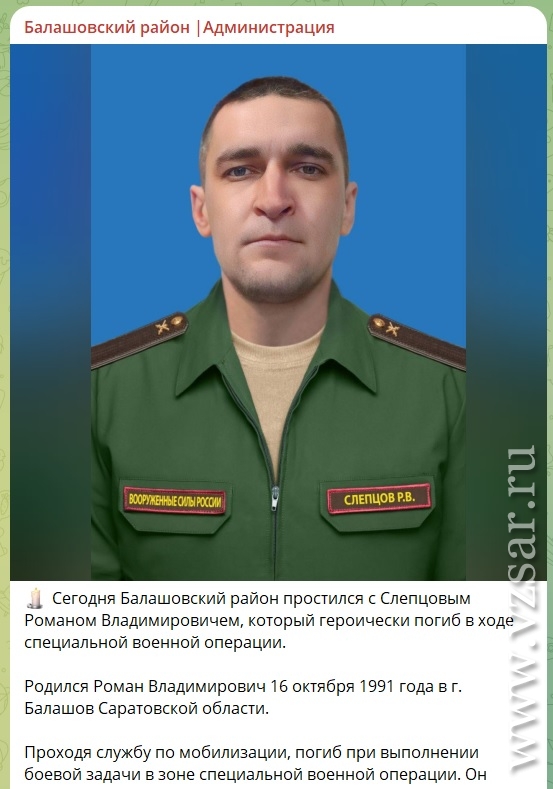 Администрация Балашовского района уведомила о гибели Романа Слепцова, родившегося в райцентре 16 октября 1991 года и проходившего службу по мобилизации.