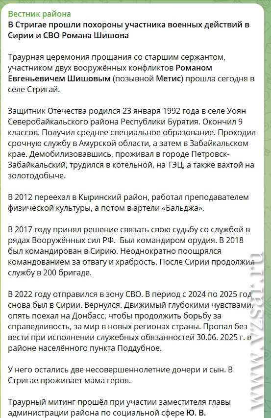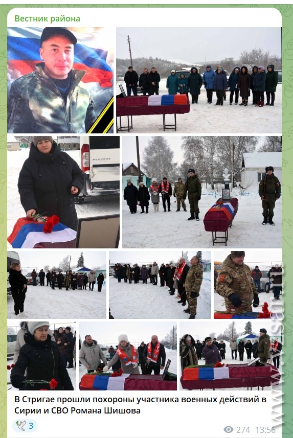 Как сообщает базарно-карабулакская муниципальная газета "Вестник района", в селе Стригай похоронили участника боевых действий в Сирии и СВО Романа Шишова.