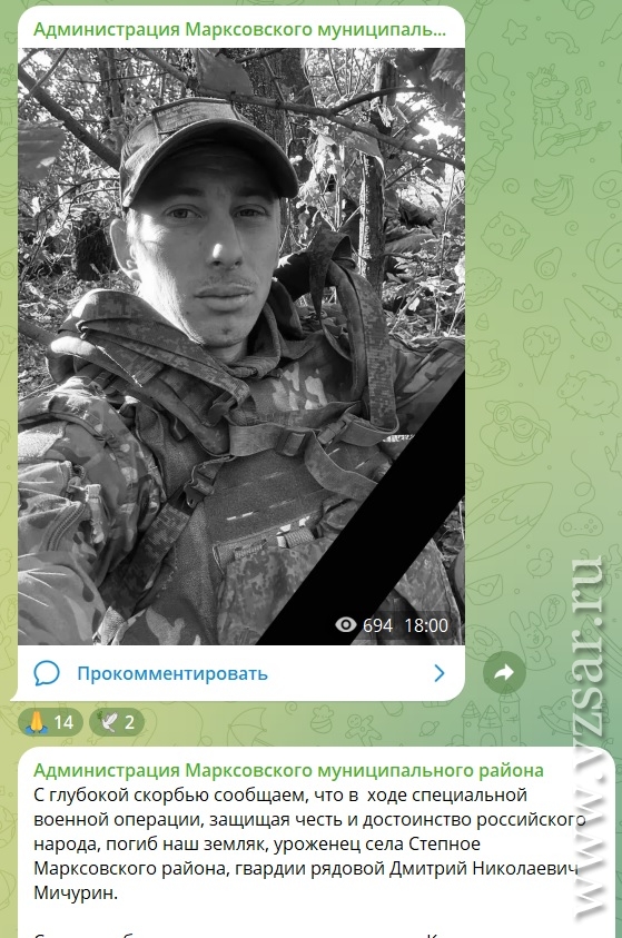 Марксовская райадминистрация сообщила о запланированном на завтра прощании с Дмитрием Мичуриным (гражданская панихида состоятся в 13.30 в Доме досуга села Степное).
