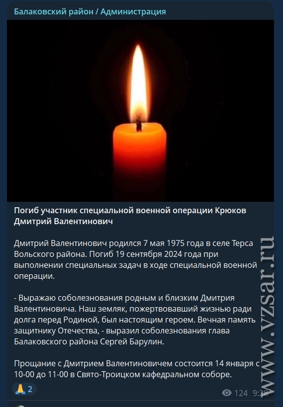 Администрация Балаковского района рассказала, что завтра состоится прощание с погибшим Дмитрием Крюковым.