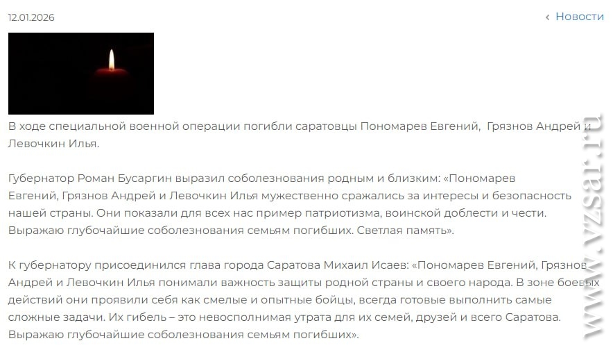 Также администрация Саратова, как обычно без подробностей, сообщила о гибели Евгения Пономарева, Андрея Грязнова и Ильи Левочкина.