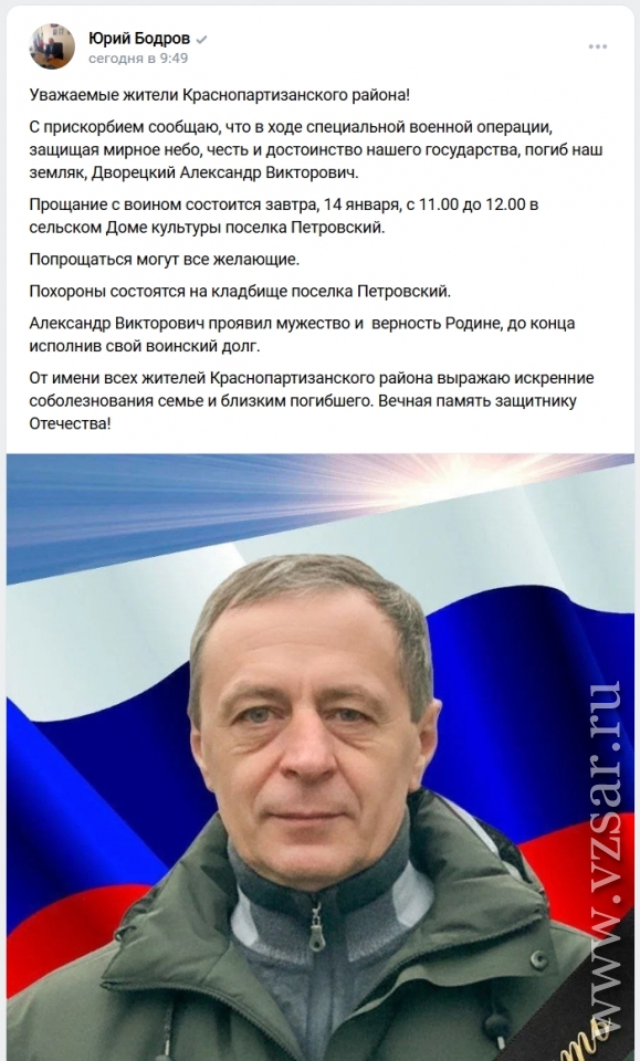 Глава Краснопартизанского района Юрий Бодров рассказал, что завтра в поселке Петровский пройдет прощание с Александром Дворецким.
