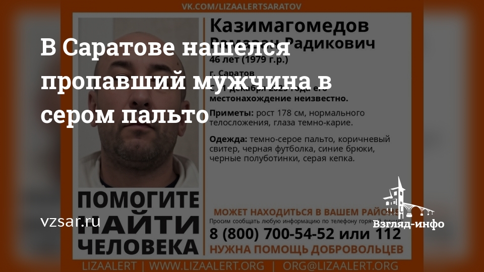 Пропавший 46-летний Рамазан Казимагомедов из Саратова найден живым. Об этом сообщает поисковый отряд "Лиза Алерт Саратов".
