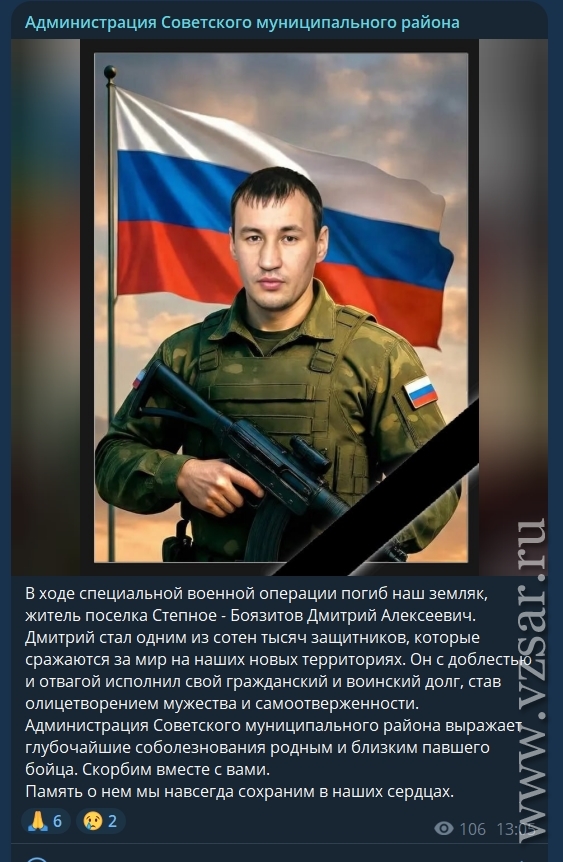 Администрация Советского района сообщила о гибели жителя поселка Степное Дмитрия Боязитова.