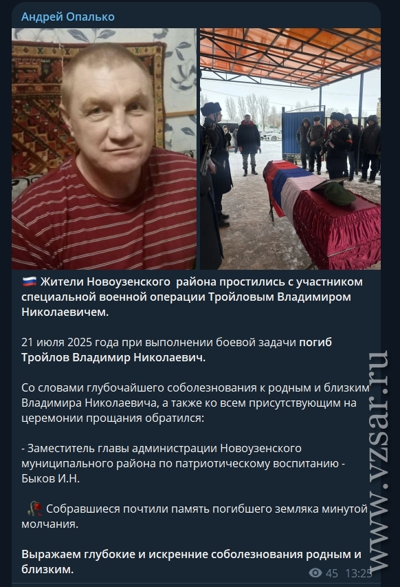 Глава Новоузенского района Андрей Опалько рассказал о прошедшем прощании с погибшим 21 июля прошлого года Владимиром Тройловым.