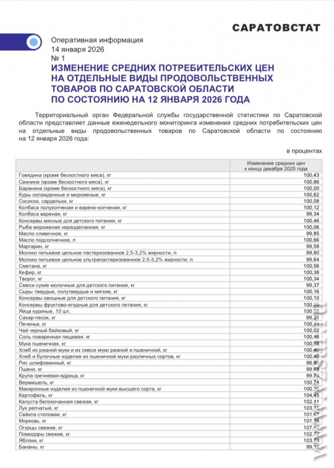 По данным на 12 января (по отношению к ценам на 22 декабря) самый значительный рост показали огурцы (+7,47%). Также замечен рост цены на картофель (+4,45%), яблоки (+3,73%), репчатый лук (+3,35%), помидоры (+2,72%), капусту (+2,41%), свеклу (+1,67%), морковь (+1,38%) По остальным продуктам, где произошло подорожание, разница оказалась менее 1%.
