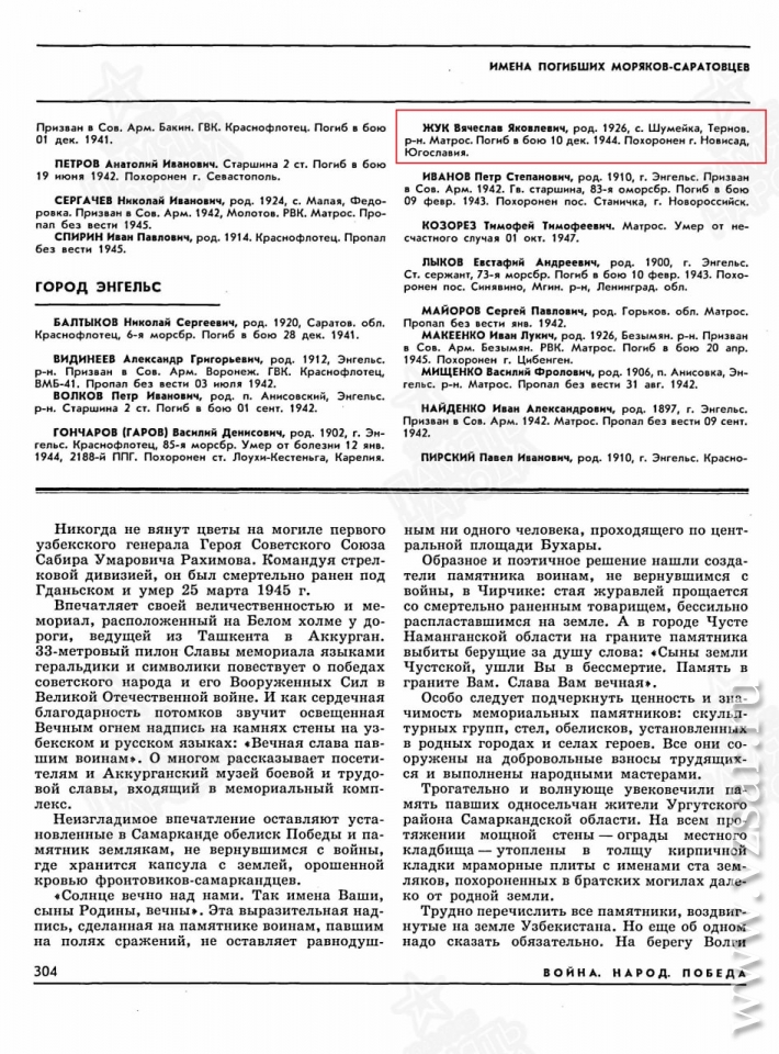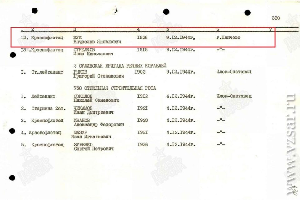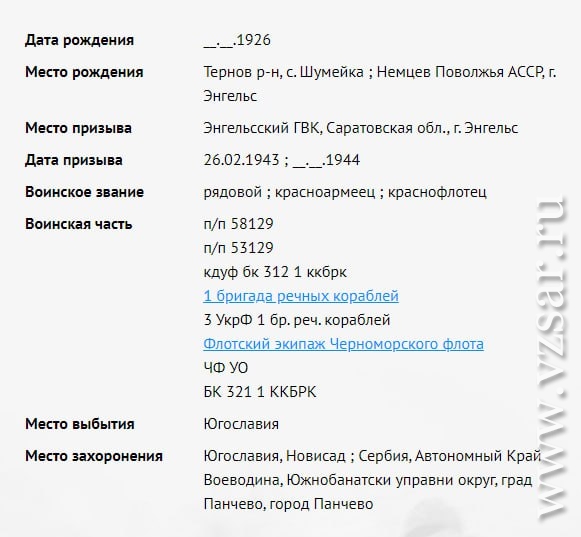 Позже, когда мы интересовались судьбами моряков, священник показал нам документы на покойных. Оказалось, что один из моряков-краснофлотцев - Вячеслав Жук - является уроженцем села Шумейка Саратовской области, был призван Энгельсским райвоенкоматом в ноябре 1943 года", - рассказали собеседники нашего издания.