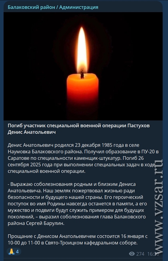 О погибшем Денисе Пастухове рассказала администрация Балаковского района.